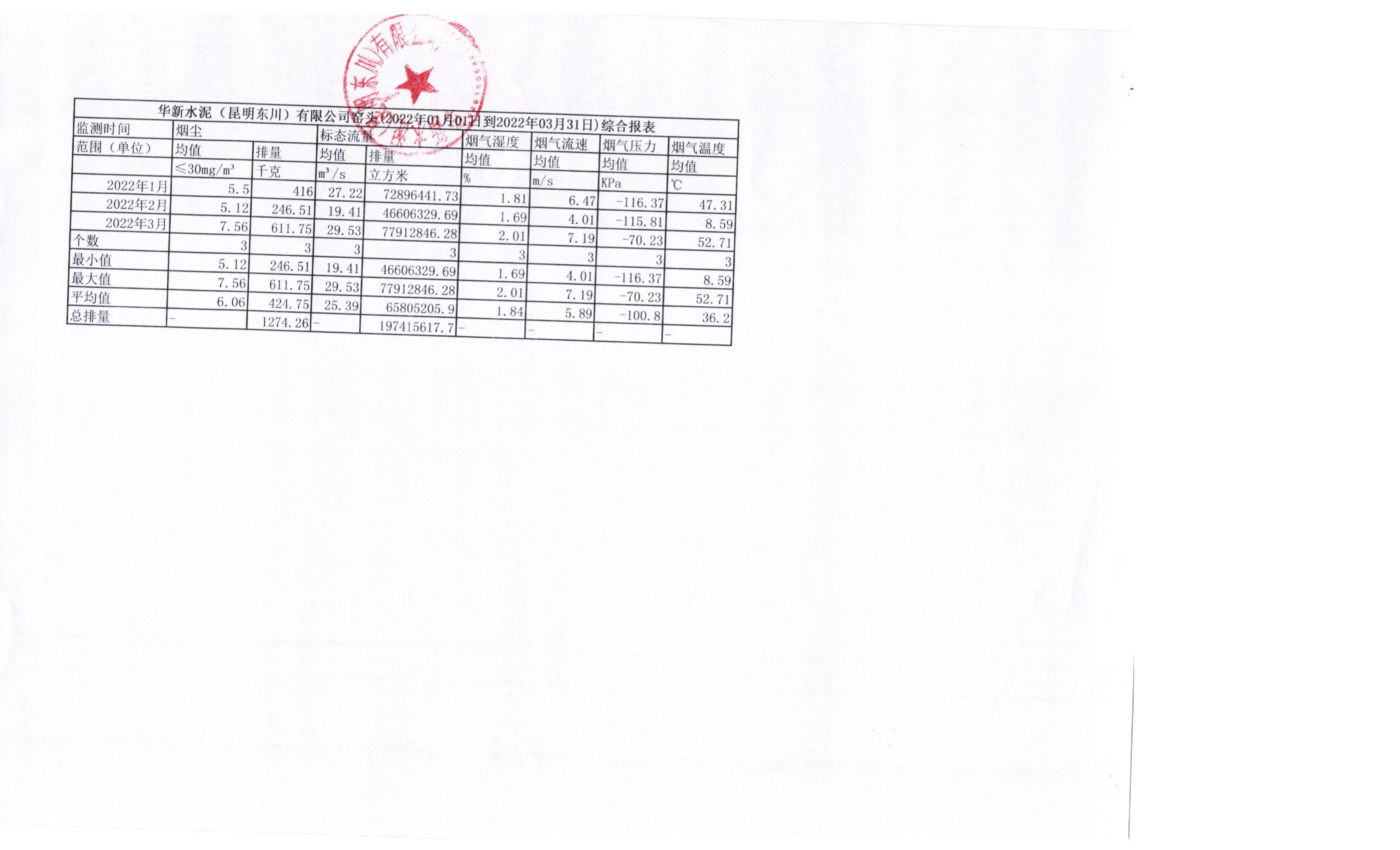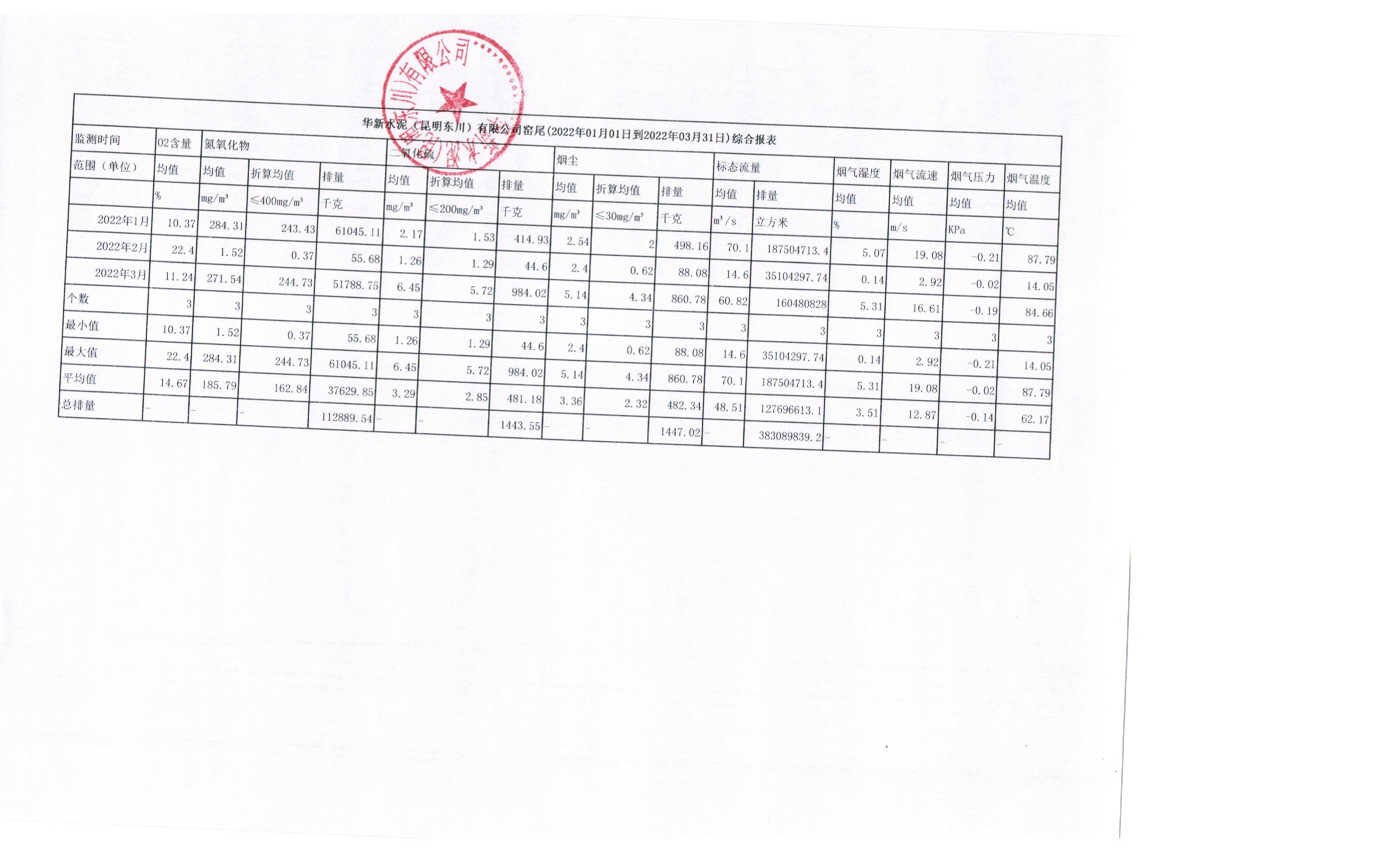 3、華新水泥(昆明東川)有限公司2022年第一季度窯頭煙氣在線監(jiān)測月平均值季報(bào)表
